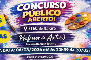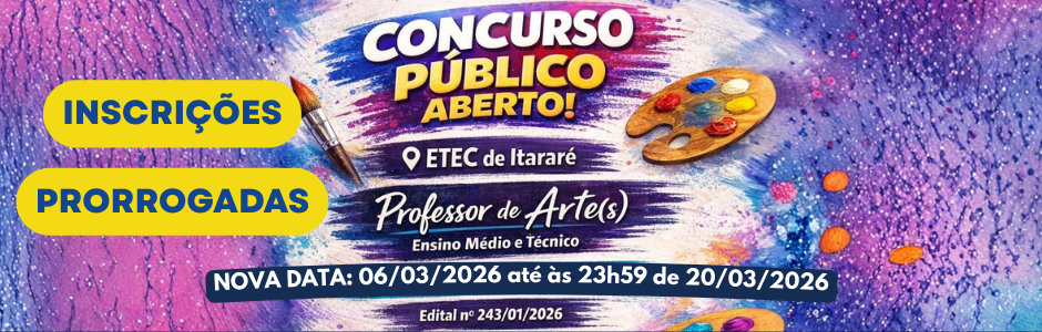 A Etec de Itararé informa que o prazo de inscrições do Concurso Público para Professor de Arte(s) – Ensino Médio e Técnico foi prorrogado. Se você é licenciado(a) na área e deseja atuar...