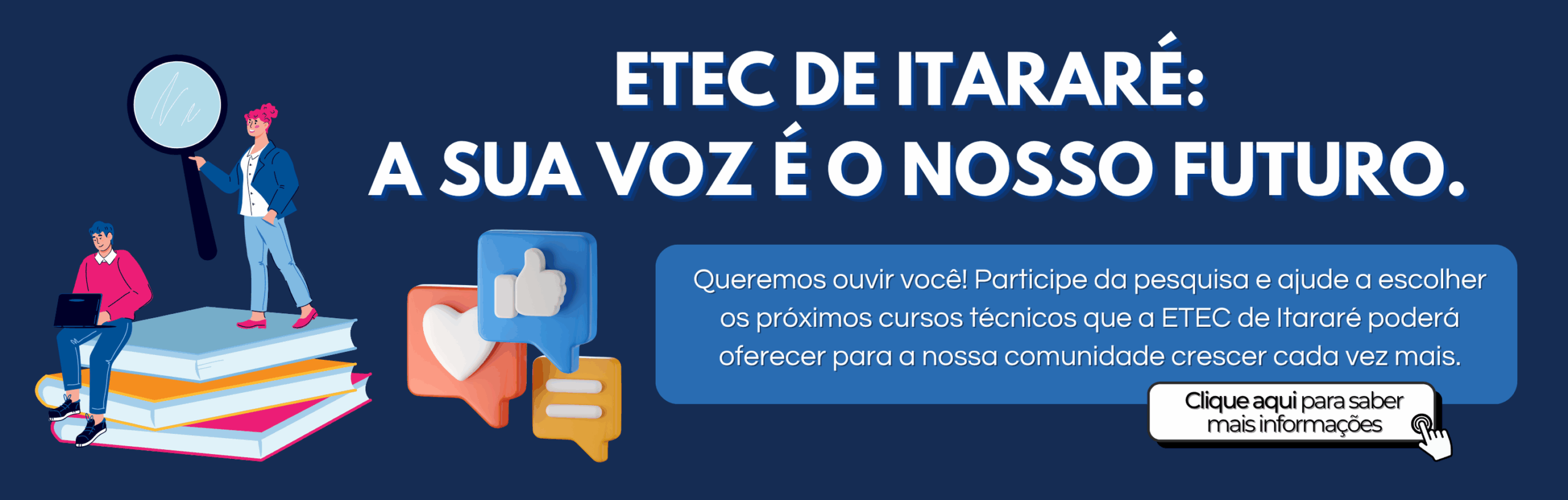 Estamos realizando uma pesquisa junto à comunidade para entender quais cursos técnicos despertam maior interesse entre os moradores e trabalhadores de Itararé. O objetivo é alinhar a nossa oferta à realidade local, reforçando nosso compromisso como instituição pública de educação profissional gratuita e de qualidade.
